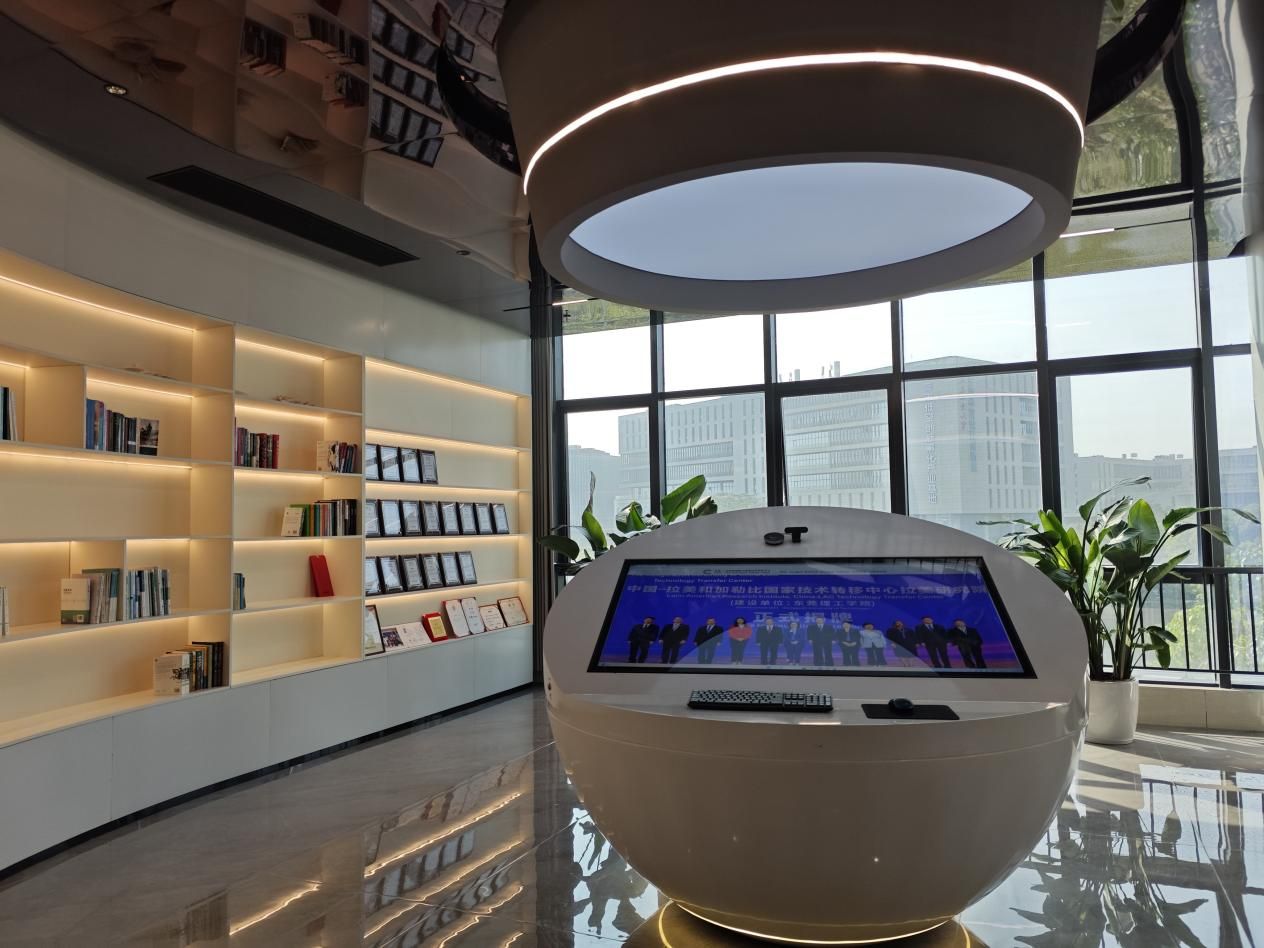 在中心展厅,中拉中心项目主管黄琼立为师生们详细介绍了中心的发展历程与组织架构。她着重讲解了中心以“研、教、商、法”为核心构建的立体化科技合作生态体系,系统展示了中心在推动中拉科技合作交流中取得的丰硕成果。师生们认真聆听讲解,就国际技术转移的实际运作与相关工作人员展开互动。