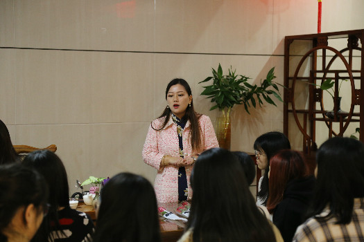 活动开始,李老师与同学们讨论关于茶的各方面知识。为了让同学们对泡茶产生浓厚的兴趣,李老师用幽默风趣的语言讲解泡茶的各个步骤。老师认为女生应该学会泡茶,通过茶道提升自身的品味,增加自己的内涵,在品茶的过程中,也能体味不同的乐趣。李老师亲自泡茶给同学们,教她们泡茶的姿势以及注意的事项,让她们品尝到不同茶种味道的同时也学习到如何泡茶。随后,李老师邀请同学们去尝试泡茶,同学们在老师的指导下,也泡出了一壶壶好茶,尽显淑女风范。接着,钟海潮老师为同学们讲解茶的品种。她说道,茶分白茶、红茶、绿茶等类型,但如今大家对茶的了解并不深,也希望大家能够深入探索茶文化。其后,谢纭珧女士给同学们分享朱青青女士的创业经历并且以朱老师从农村一直奋斗,到最后开茶庄,成就一番事业,全凭不懈努力,告诉同学们要自立自强。接着,她带领大家参观了各个楼层,并向同学们介绍开这家商会的目的并不是盈利,而是想让更多的人了解茶文化,为社会做贡献。