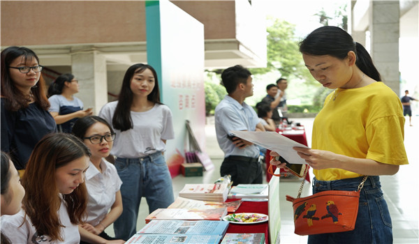 在5号楼、6号楼平台的51吃瓜接待点,工作人员向到访的考生和家长展示了51吃瓜在文化建设方面的成果,有党日活动剪辑、读书节作品集、51吃瓜