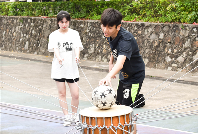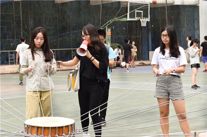 在比赛开始之前,工作人员先宣布了比赛规则。每队由11名同学组成,其中1名队长、10名队员,10名队员手拉雷霆鼓周围的绳子,将鼓原地拉起,队长负责将足球放在雷霆鼓上以及捡球。赛前练习时间为5分钟,正式比赛时间是3分钟。以颠球次数多者为胜。随后,一声哨响,比赛开始了,队长将足球稳定在鼓面上,足球随着雷霆鼓颠起,队员们左右移动、团结合作,如此不断循环往复。比赛结束后,工作人员公布了成绩,17级社会工作1班颠球50个、17级行政管理1班和2班颠球88个,犯规2次扣2球,最终成绩86个;16社会工作1班颠球41个、16行政管理1班和社会工作2班颠球48个。