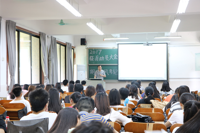 于6月1日下午在莞城校区1311教室召开了征兵动员大会和考风考纪大会。各班班委以及有意愿入伍的同学等150余人参加了大会。