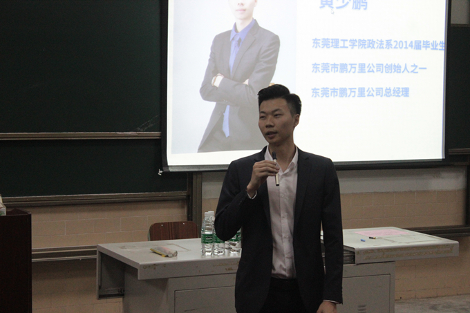政法系2014届的毕业生,是东莞市鹏万里公司创始人之一,现任东莞市鹏万里公司总经理。黄少鹏师兄主要和我们分享了自己在职场中的经历,还讲述了关于企业应聘、面试、写简历等方面的内容,使在座的同学们受益匪浅。