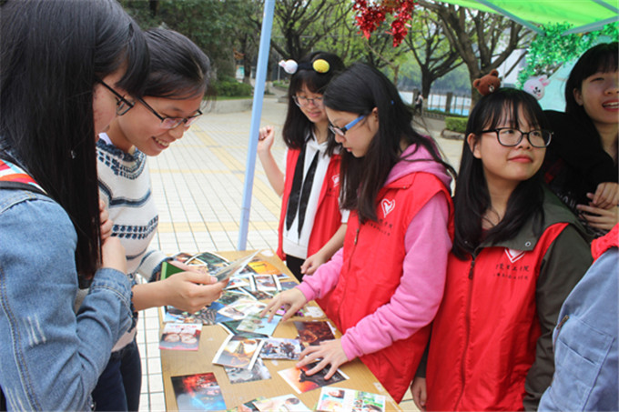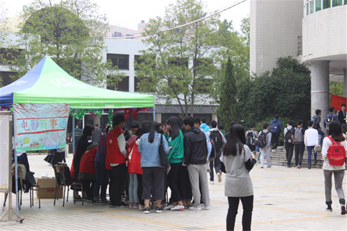 团总支志愿服务站的小干事在第一饭堂门前撑起帐篷,布置好桌椅,开始“猜影大师”的百事通活动。干事们首先把事先准备好的电影场景照片陈列在桌面上,同时现场也可以观看这些好电影的小视频,吸引了不少路经饭堂的同学们。