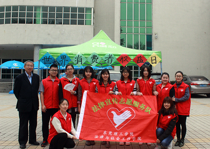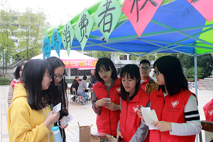 团总支法律宣传志愿服务队于世界消费者权益保护日,在一饭门前开展摆摊活动,宣传消费者权益保护知识。