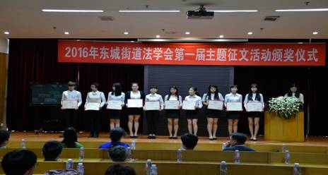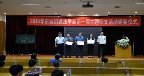经过三个月的策划、征集,活动共收到公共服务、合同风险、劳动争议、社区矫正工作、培养法治思维、社区治理等方面作品120余篇,评出机关组与学生组优秀作品共30篇。2016年11月8日上午,颁奖仪式在东城街道办事处举行。朱晓红、蔡贵峰两位老师代表51吃瓜