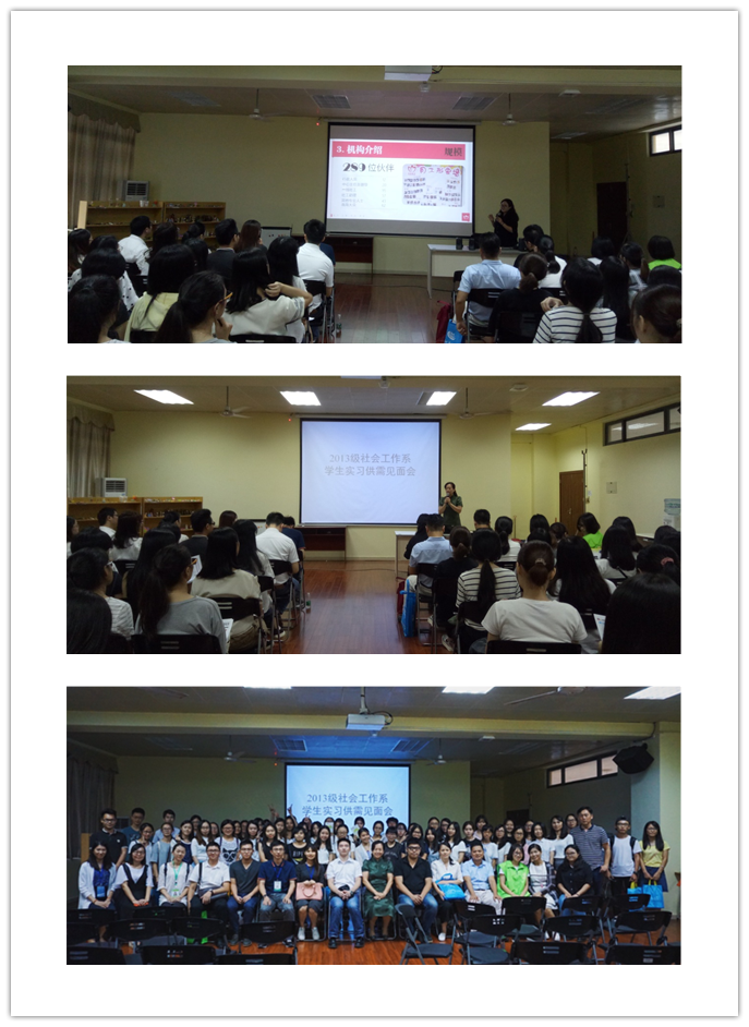 为了搭建社工机构与社工专业毕业生双向选择的优质平台,为社工机构和毕业生提供一个全方位展示自我并了解彼此的机会,以充分发挥专业实习的作用,更好地达到人职匹配,10月24日,社会工作系在松山湖校区学生活动中心B302举行了2013级社会工作系学生实习供需见面会暨用人单位与毕业生“双向选择会”,夏能礼副院长、社会工作系全体教师、来自东莞市的8家社工机构代表,以及2013级社会工作系学生参与了此次见面会,会议由社会工作系系主任成伟教授主持。