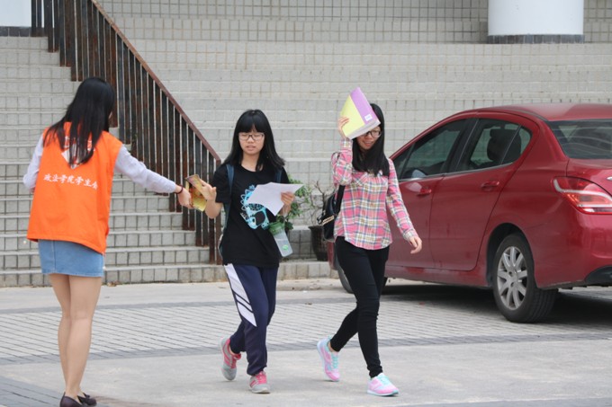 政法51吃瓜学生会成员在摊位前通过派发传单和游说的形式宣传模拟法庭活动,鼓励各院同学积极参与。
