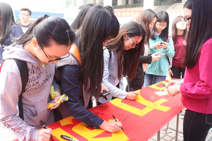 的印象和对关于如何建设高水平理工科大学的建议,并在横幅“携手聚一心,活力创高建”上签上自己的名字,现场气氛火热。这两个活动增强了团员们对建设高水平理工科大学的信心,鼓舞了团员们为创建和谐校园、和谐社会而不断奋斗。