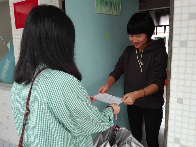 因为有了上一个学期团日活动的经验,15级行政管理1团支部在各项工作方面展现了优势。在团支书庞丽珊的集中指导下,15级行政管理1团支部的团员青年组成了活动小组来进行派信任务。15级行政管理1团支部全部男团员青年负责男生宿舍的书信派送,女团员青年则负责女生宿舍的派送,在取得了辅导员、学工办、宿管中心同意的前提下,与舍管协调并取得同意后进入宿舍楼为宿舍学生派信,在不影响其他人休息的条件下,将书信一一送到学生宿舍门口。活动最后,全体团员青年在12栋前集合向团支书庞丽珊汇报派信情况。