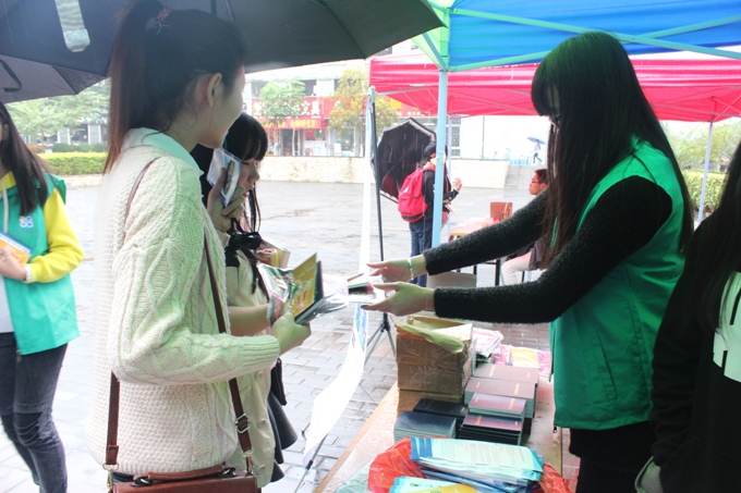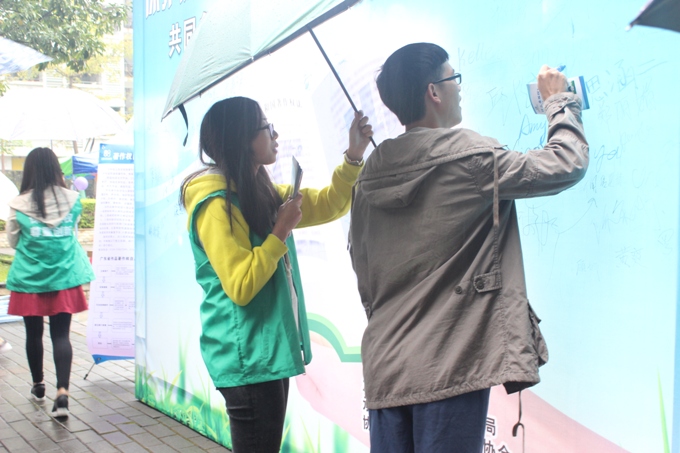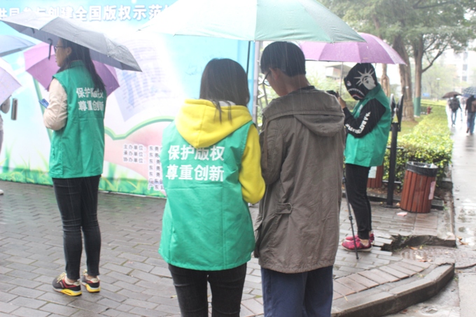 虽然下着雨,但是同学们看见我们会停下脚步,乐意花费几分钟听我们的讲解。同学们拿到宣传单张,了解到保护版权的重要性后主动要求要在宣传牌上签上他们的名字,来支持我们保护版权的活动。