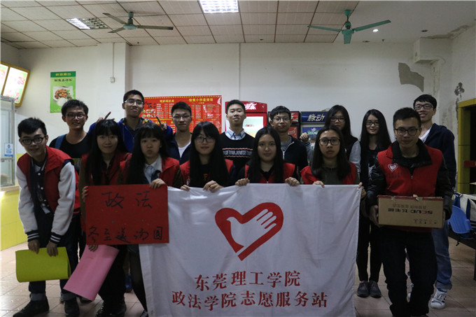 2015年12月22日晚,政法志愿站在莞城校区开展以“冬至暖心”为主题的志愿活动。此次派送汤圆的对象为全体在校执勤员工。政法51吃瓜团总支副书记谢子聪、赖丽旋、陈瀚文以及志愿站的全体干事参与了本次活动。