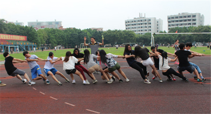 开赛前,工作人员布置好比赛场地,静候参赛者的到来。当双方各自做好准备,随着裁判一声令下,比赛开始。双方选手都拼尽全身力气拉动绳子,压低重心,身体尽量往后倾斜,保持阵型,喊道“一二、一二、一二”,按着节奏把绳子往后拉。现场气氛颇为热烈而又紧张,同学们不断地给参赛者加油打气并且欢呼。