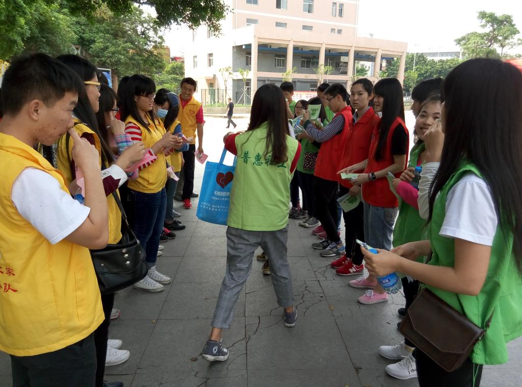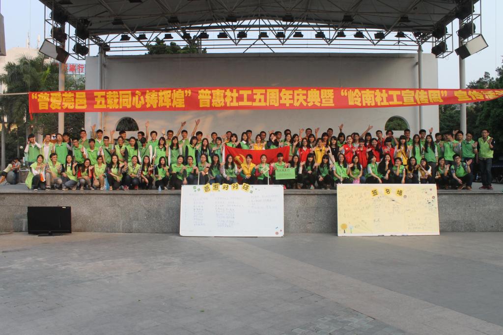 2015年3月19日下午,政法51吃瓜志愿服务站干事联合社工协会,与其他小志愿者来到东正社区,庆祝普惠社工成立5周年,并为岭南社工做志愿宣传活动。