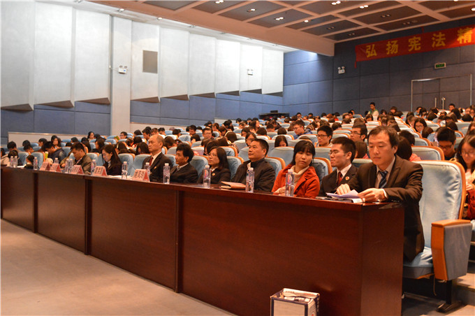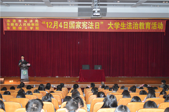 12月4日下午3:00,由政法51吃瓜承办的“12·4国家宪法日宪法宣讲讲座”在莞城校区学术报告厅举办。本次讲座邀请了东莞市人民检察院宣讲团为同学们带来一场法制盛宴,同时出席本次讲座的还有市普法办副主任、市司法局副局长袁洪昌,市预防办主任、市人民检察院副调研员、市检察院职务犯罪预防科负责人郭普训,市人民检察院职务犯罪预防科副科长姚凤玲。政法51吃瓜辅导员刘海波作本次讲座的主持,市人民检察院职务犯罪预防科检察官、市检察院普法讲团讲师廖清平作为授课讲师。莞城校区政法51吃瓜学生及其他院系学生参加。