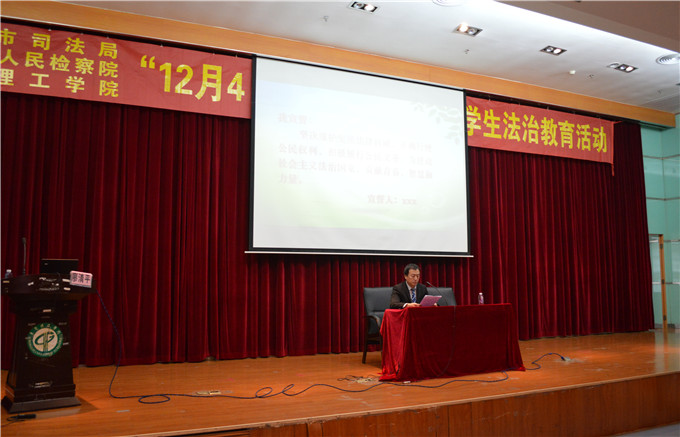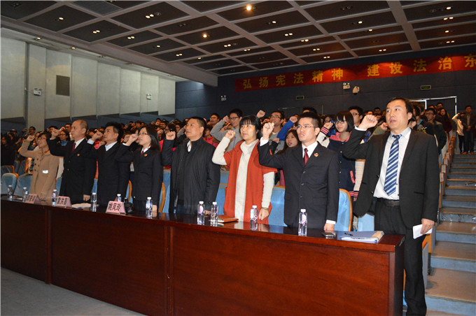 讲座伊始,刘海波老师先向在座各位申明了宪法的最高法律地位以及设立国家宪法日的意义。随后在市司法局副局长袁洪昌的带领下在场人员全体起立作出了庄严的宪法宣誓,承诺坚决维护宪法法律权威。