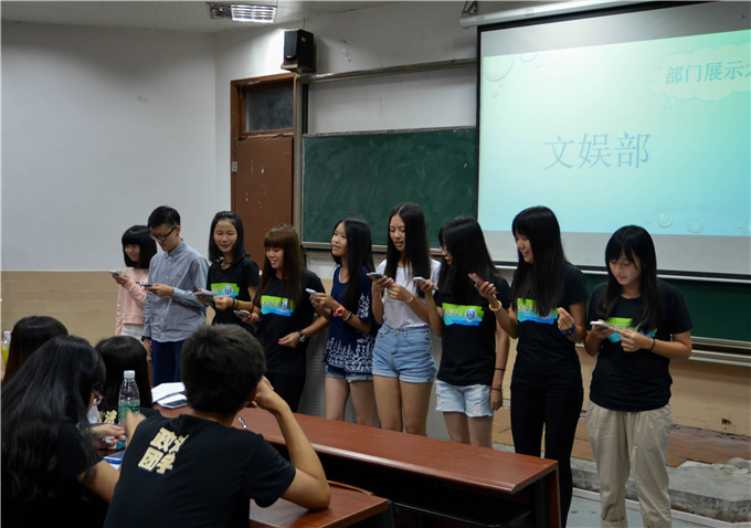 接下来,轮到众人期待已久的游戏环节,各部门先是进行了紧张刺激的“你划我猜”游戏,现场气氛再次活跃起来,欢声笑语充斥在会场之中。关于早上的拓展活动以及晚上的全体大会的感受,学习部、体育部等部门的几位新干事在 “我要抢麦”的环节中和在场众人分享了自己的感受。在大会的尾声,学生会副主席吴丹丹上台作总结,表达了对学生会共同努力、团结友爱的期盼。全体大会在众人演唱的学生会会歌歌声中划上了完满句点。