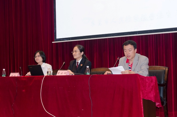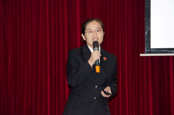 开会伊始,黄云丽检察官向同学们提出“什么是法律?”,从而一步步地让同学们了解法律知识。紧接着,黄云丽检察官从她身边一个个真实的案例向同学们分析,剖解出社会的现状并且介绍了法庭的庭审的主要流程和架构,极大地丰富对同学们对社会和法庭的了解。而后黄检察官的教案中显示的监狱情况让现场沉寂了下来,这警醒着大家做每一件事情之前都要三思而后行,不得鲁莽冲动,从而受到法律的严惩。