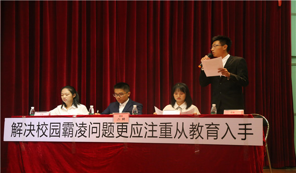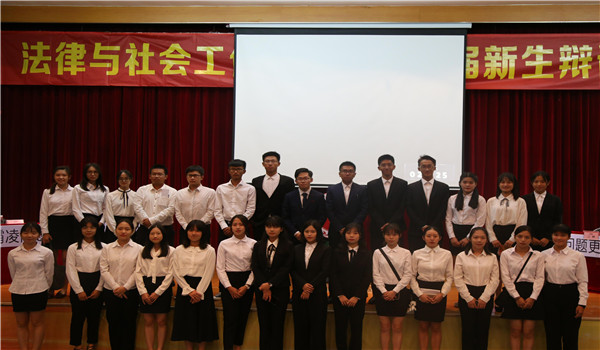 第十六届新生辩论赛决赛在莞城校区学术报告厅举行。本次辩论赛分为季军赛和冠军赛。季军赛的辩题为“社会秩序的维系主要靠道德/法律”,由2019级知识产权一班对战2019级法学二班;冠军赛的辩题为“解决霸凌更应注重从法律/教育入手”,由2019级行政管理二班对战2019级法学卓越班。出席本场比赛的嘉宾有辅导员邹欢老师,法社辩论队队长靳文怡、法社辩论队副队长曾娴榕、经管辩论队队长邓卓立、粤台辩论队队长胡晓彤作为本次比赛的评委。