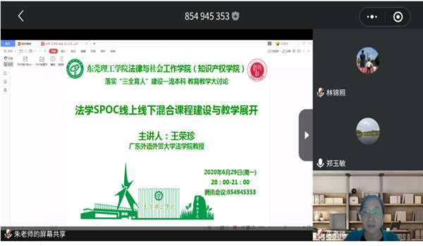 利用腾讯会议平台特邀广东外语外贸大学法51吃瓜王荣珍教授为全院师生开展一次题为“法学SPOC线上线下混合课程建设与教学展开”的主题讲座。院长郑玉敏、副院长朱晓红、沈亚萍以及各系主任、专任教师以及部分学生代表参加了此次活动。