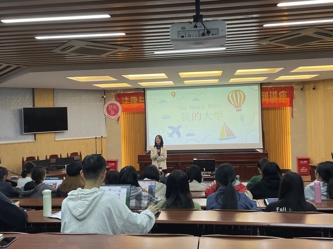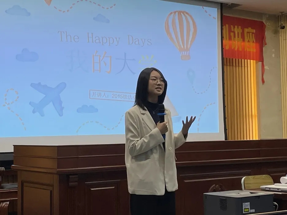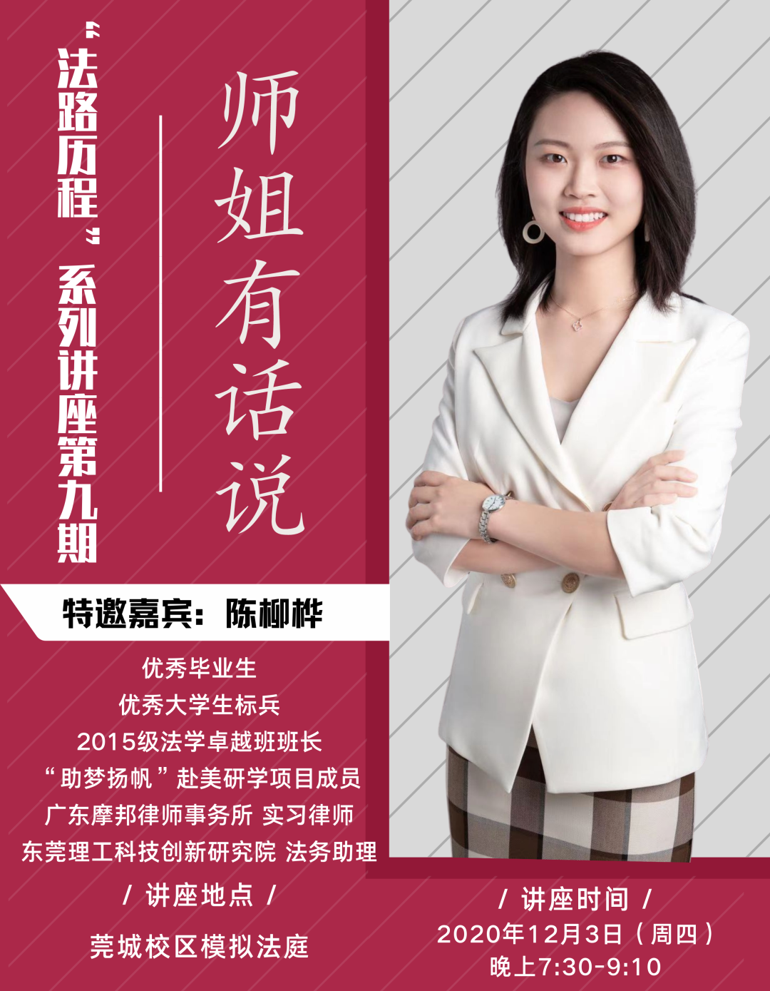 (知识产权51吃瓜)在莞城校区模拟法庭举行“法路历程”第九期系列讲座,本次讲座由15级法学卓越班班长陈柳桦师姐主讲,意在向师弟师妹分享学习经验,19级法学卓越班班主任李文伟老师出席本次讲座。