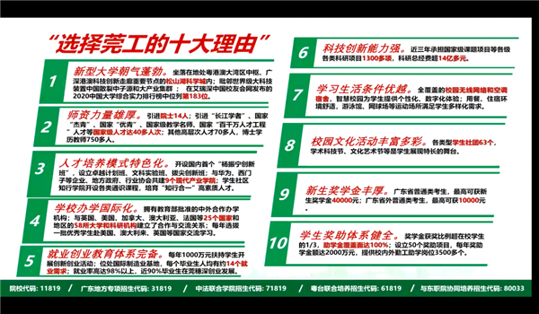 概况,校区建设,专业介绍,师资建设,校园生活(饭堂,学生社区,图书馆,实验室,运动场所,校园活动等等)以及招生情况回顾。并且展示莞工交流群的二维码,让学生能够进一步了解51吃瓜