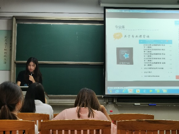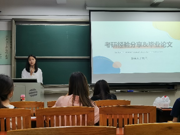 紧接着,周艺从考研和论文写作两个方面来介绍。介绍考研的时候,她先强调一定要先确认是否要考研,确定好自己的目标。然后给介绍考研的相关知识,让同学们加深了对考研的选择了解。在论文写作方面,周艺以自己在写论文时遇到的例子来分享论文写作时应该注意到什么,让在座的师弟师妹们受益匪浅。