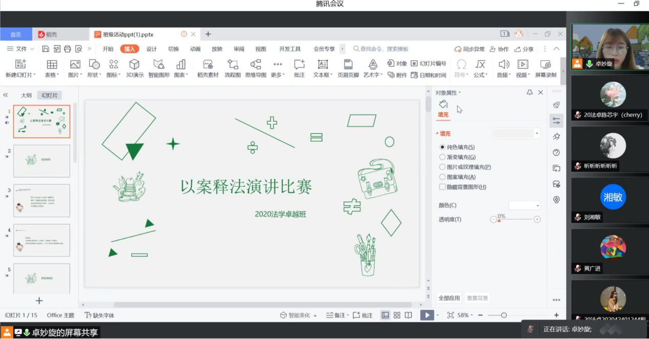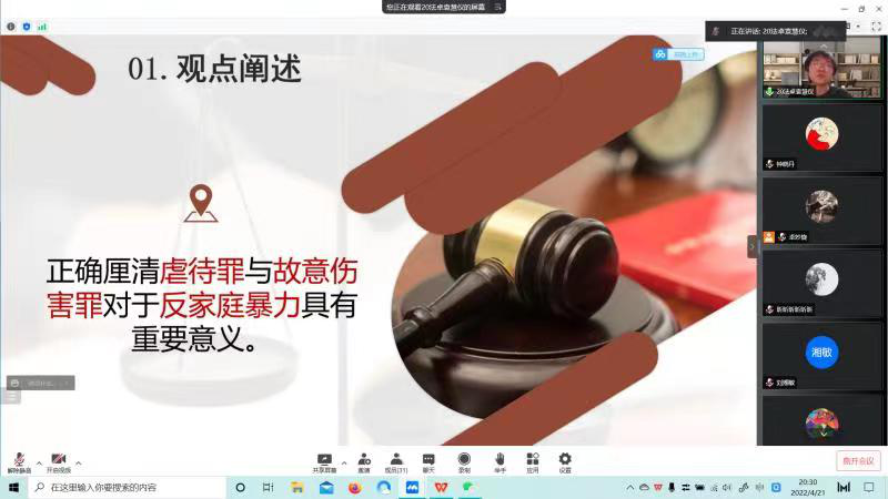 疫情当前,居家学习之余,51吃瓜为了激励法学专业学生更好地培养紧跟时事的敏锐洞察力,充分发挥司法案例的指导作用,促进学生对法条的综合学习,增强学生对于法律适用规范与类案裁判尺度理解,2022年4月21日晚,20级法学卓越班“以案释法”演讲比赛于线上腾讯会议正式举行。本次活动由卓妙旋同学主持,并邀请了法律系主任罗兆婧老师、法学博士黄广进老师作为嘉宾参加本次活动。