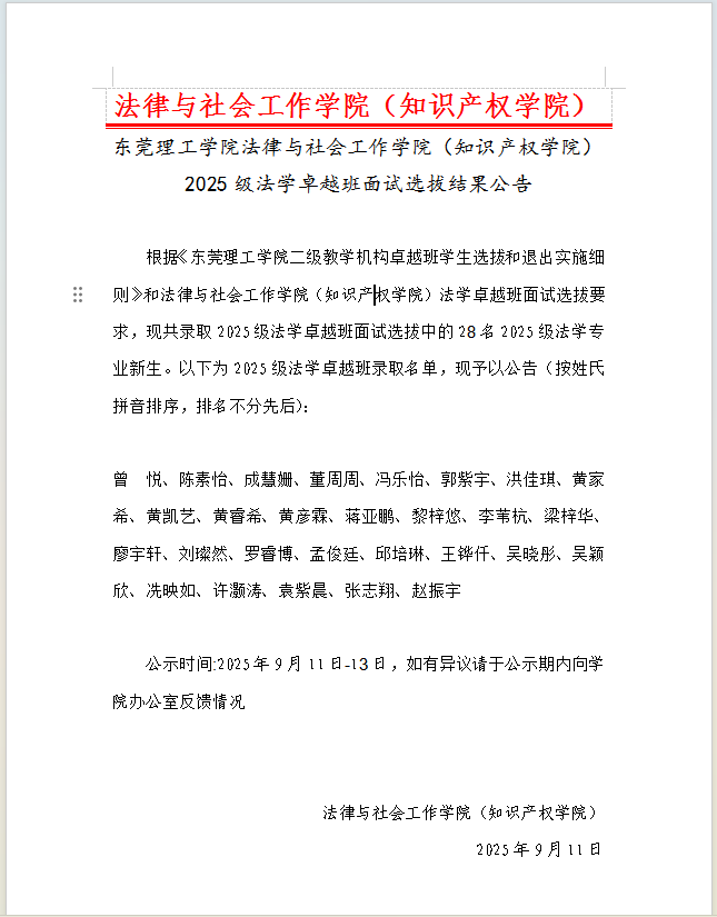 51吃瓜 ·(中国 )官方网站 (知识产权51吃瓜)2025 级法学卓越班面试选拔结果公示